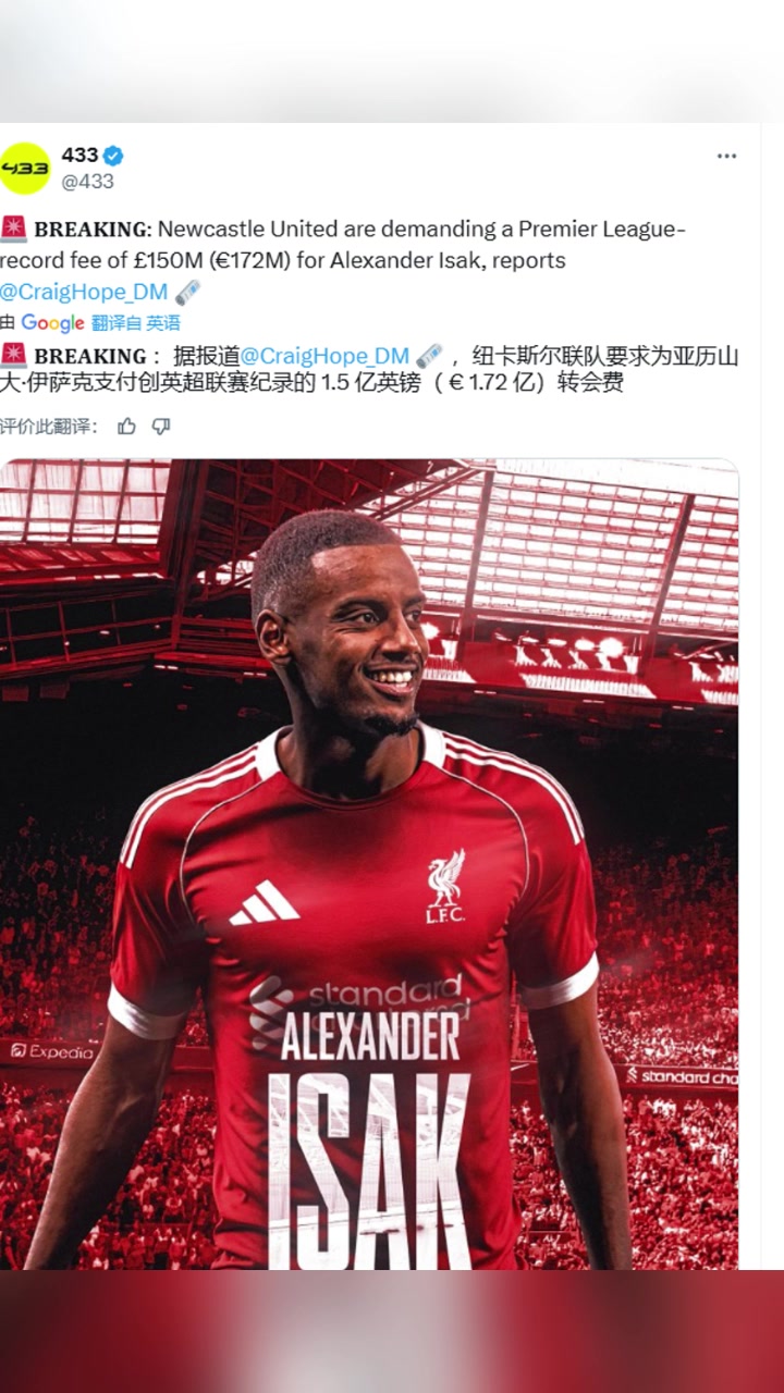 每日邮报首席记者纽卡为伊萨克开出创英超纪录的1.5亿镑转会费