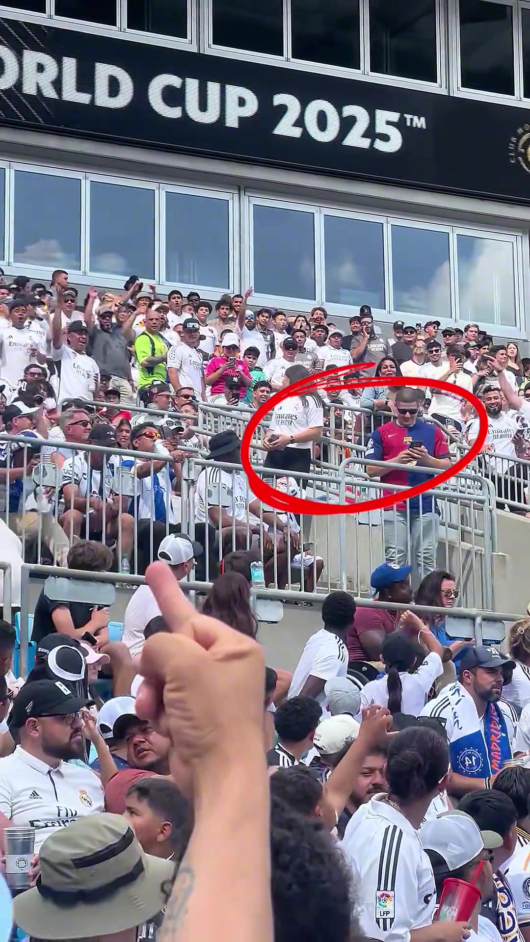 太勇了一巴萨球迷穿巴萨球衣现身皇马世俱杯看台被丢水瓶