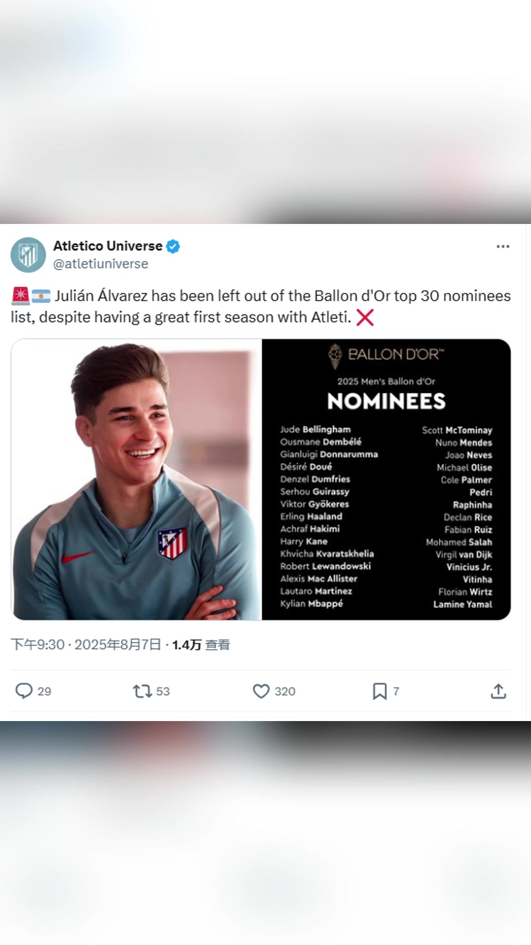 不服博主小蜘蛛上赛季表现出色他被排在金球奖前30名之外