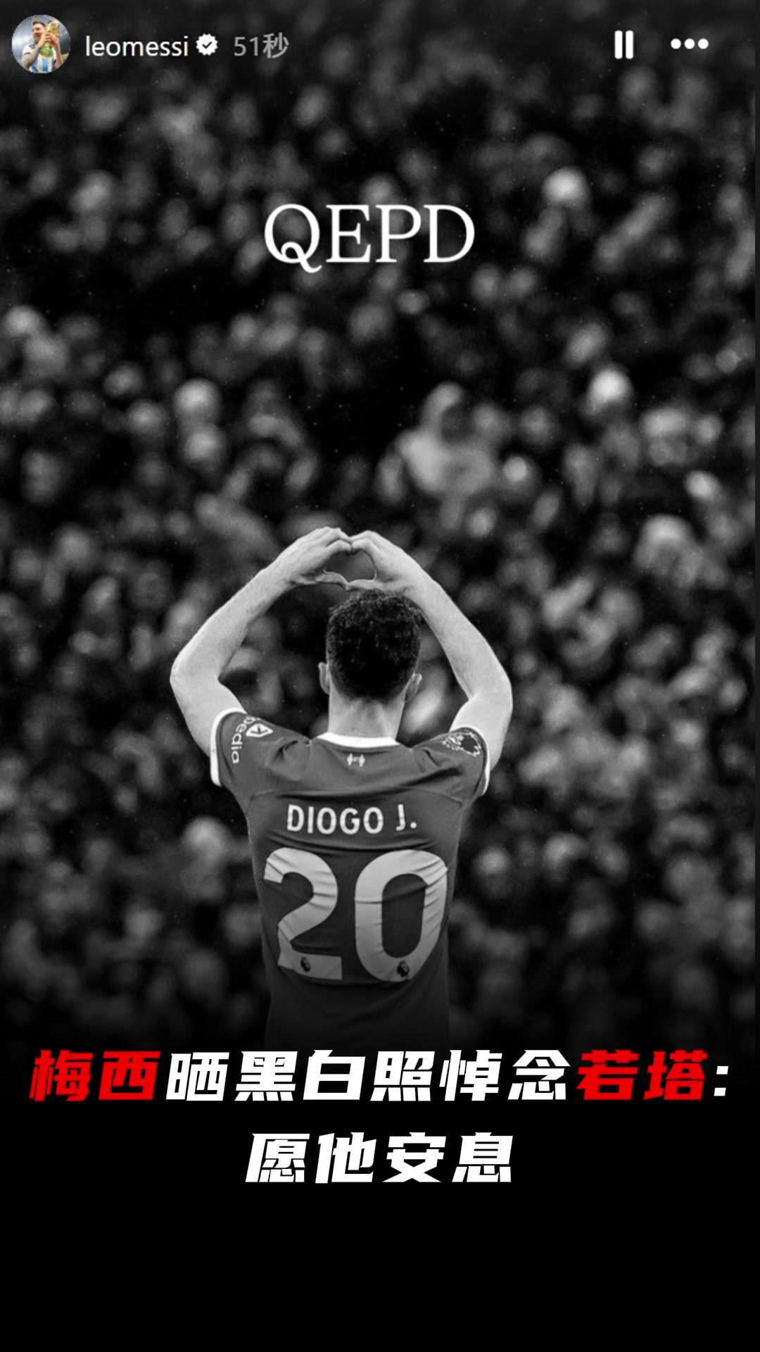 梅西社媒晒黑白照悼念若塔愿他安息