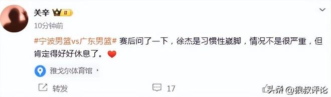 不久前,廣東體育頻道記者關辛發文報道,徐傑是習慣性崴腳,情況不是很嚴重,但肯定得好好休息瞭。