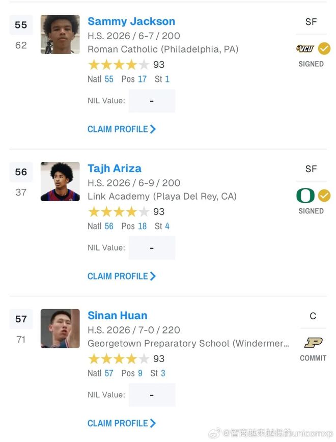 本周更新的Rivals2026屆全美高中生排名,張博源上升至第25位,成為該榜單歷史上排名最高的中國球員,另外,同批的國青內線核心郇斯楠則排名57位,兩人同為四星高中生 。