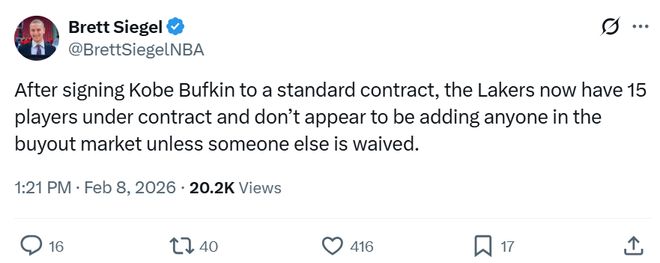 名記Brett Siegel跟進表示,這意味著,湖人15人名單滿員,除非是裁掉某個球員,否則湖人不會在買斷市場上簽下任何球員。