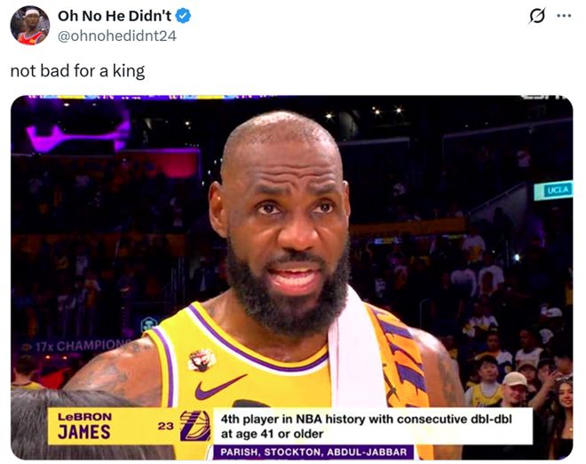 同時也成為NBA歷史上第四位在41歲後還能連續兩場交出兩雙的球員,前三人分別是帕裡什、斯托克頓和賈巴爾。