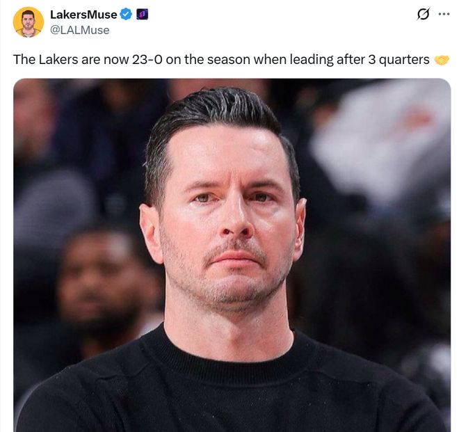 本場擊敗勇士隊後,開賽至今,當湖人隊領先進入第四節時拿到瞭23勝0負的全勝戰績。