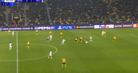 比赛开打之后第9分钟,多特蒙德创造出了一次极具威胁的射门机会,吉拉西门前接到队友似传似射的传球,获得了直接和门将一对一的机会,可惜打门绵软无力被索默轻松将球没收,错失了取得梦幻开局的绝佳机会,逃过一劫的国米,5分钟之后通过反击给了迪马尔科禁区内起脚的空间,后者的大力轰门被多特门将稳稳抱在怀中。
