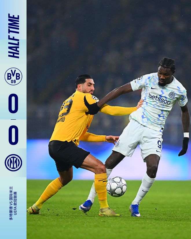 上半场比赛结束,我们暂时客场0比0战平多特蒙德。