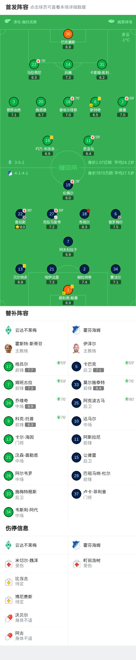 北京时间1月28日,德国足球顶级联赛第16轮,云达不莱梅主场对阵霍芬海姆。克拉马里奇送出助攻,普拉斯破门得分;随后布格尔被罚离场;普罗梅尔再入一球。最终,云达不莱梅0–2不敌霍芬海姆。