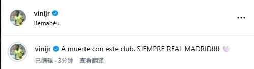 赛后,维尼修斯在社交媒体上发文表示:“至死忠于这家俱乐部,永远都是皇家马德里!!!”
