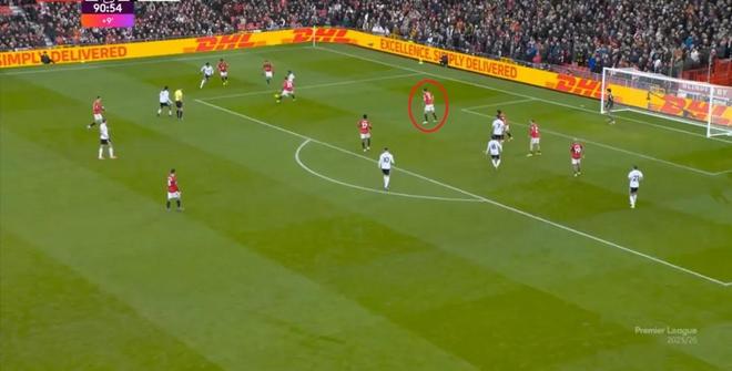所以,阿瑪德-迪亞洛的確防守職責輕微,這也是其在本場比賽經常呈現的樣子,但也正是因此,馬奎爾的位置不能退得太靠後,你要隨時做好阿瑪德-迪亞洛防守不力,甚至放棄防守的準備,因為不算阿瑪德-迪亞洛的的話,邊路等同於二防二。