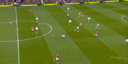 然後在不斷的連續進攻當中,卡塞米羅找到瞭庫尼亞,讓曼聯打進瞭第二球,但在庫尼亞的進球之外,不要忘記曼聯之所以能來到前場,是源自梅努在後場的帶球和斜傳: