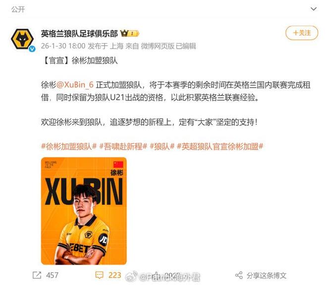 去EFL俱樂部 (例如國內盛傳的Barnsley(註:巴恩斯利)): 確實如官宣所說,可保留狼隊 U21 參賽資格,實現“雙線作戰”。不過EFL(英冠、英甲、英乙)屬於職業聯賽,受職業轉會窗限制。冬窗已於2月3日凌晨關閉,目前仍無徐彬租借消息。極端情況,若徐彬仍是自由球員,還有一線機會。