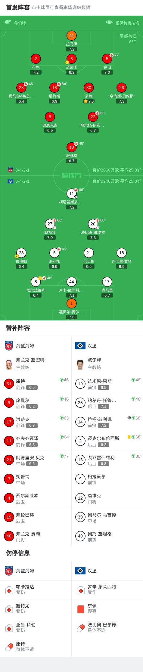 北京时间2月7日德国足球顶级联赛 联赛 第21轮,海登海姆主场对阵汉堡。汉堡柯尼希斯多费尔破门,拉扬-菲利佩破门。最终比分海登海姆 0-2 汉堡。