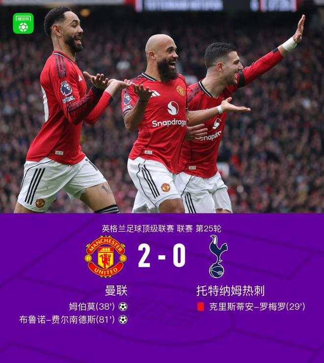 北京時間2月7日英格蘭足球頂級聯賽第25輪,曼聯主場對陣托特納姆熱刺。上半場,羅梅羅因踩踏動作吃到紅牌,之後姆伯莫破門。下半場,佈魯諾-費爾南德斯再下一城。最終比分曼聯2-0熱刺。
