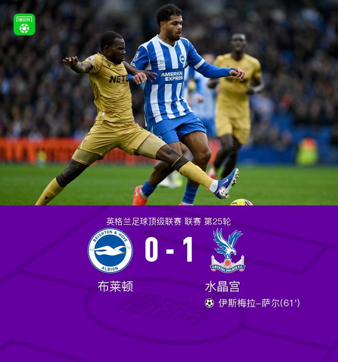 北京時間2月8日英超聯賽第25輪,佈萊頓主場對陣水晶宮。伊斯梅拉-薩爾推射破門打進全場唯一進球,尤爾根-拉森造險。最終,水晶宮1-0客勝佈萊頓,取得近13輪首勝。