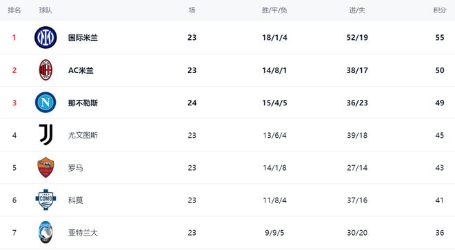 在積分榜上,國際米蘭依然高居榜首,18勝1平4負拿到55分。AC米蘭緊隨其後,拿到50分,落後5分。那不勒斯以49分排名第3。那不勒斯比前兩名的球隊多踢1場。尤文圖斯以45分排名第4。羅馬拿到43分,排名第5。科莫以41分排名第6。亞特蘭大隻拿到36分,排名第7。第8的是拉齊奧,隻有32分。