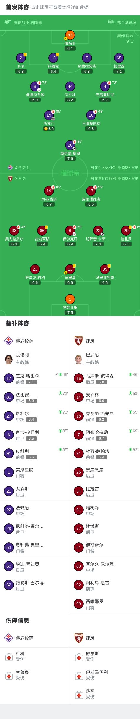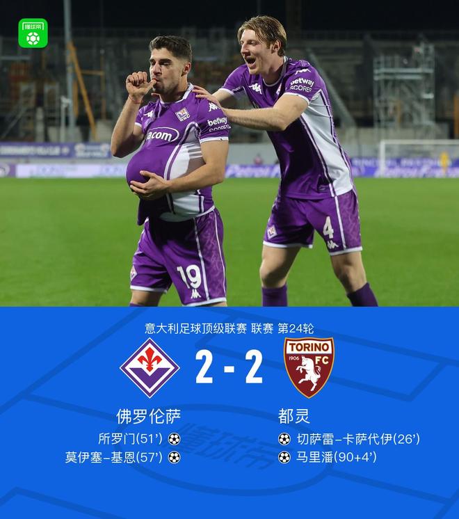 北京時間2月8日意大利足球頂級聯賽第24輪,佛羅倫薩主場迎戰都靈。比賽中,都靈率先取得進球;隨後佛羅倫薩連入兩球反超比分;但都靈在比賽尾聲階段再度破門,最終兩隊2-2握手言和。佛羅倫薩方面所羅門、莫伊塞-基恩各入一球,都靈則由切薩雷-卡薩代伊、馬裡潘完成破門。
