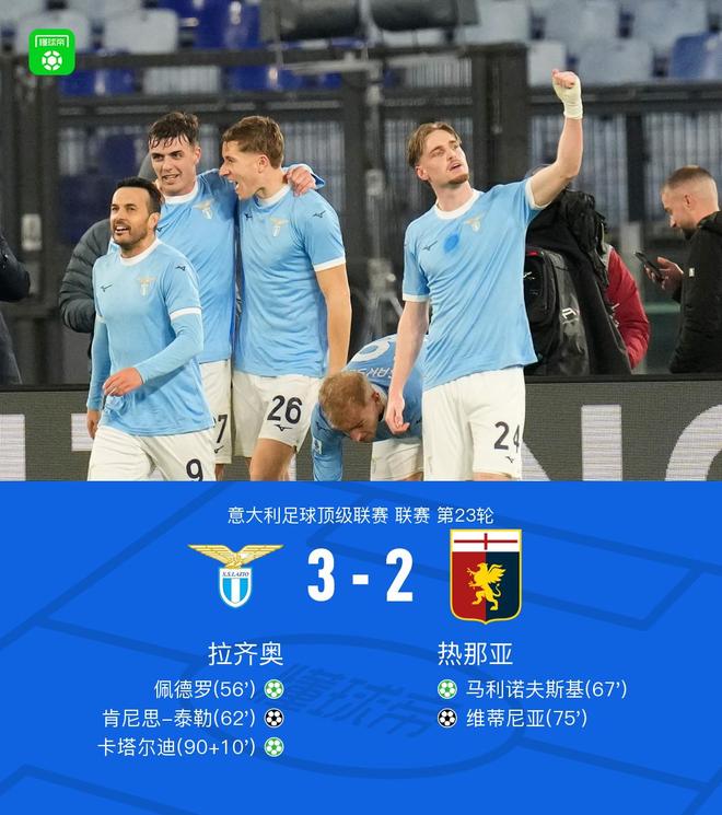 北京時間1月31日意大利足球頂級聯賽 聯賽 第23輪,拉齊奧主場對陣熱那亞。拉齊奧佩德羅破門,卡塔爾迪破門,肯尼思-泰勒破門。熱那亞馬利諾夫斯基破門,維蒂尼亞破門。最終比分拉齊奧 3-2 熱那亞。
