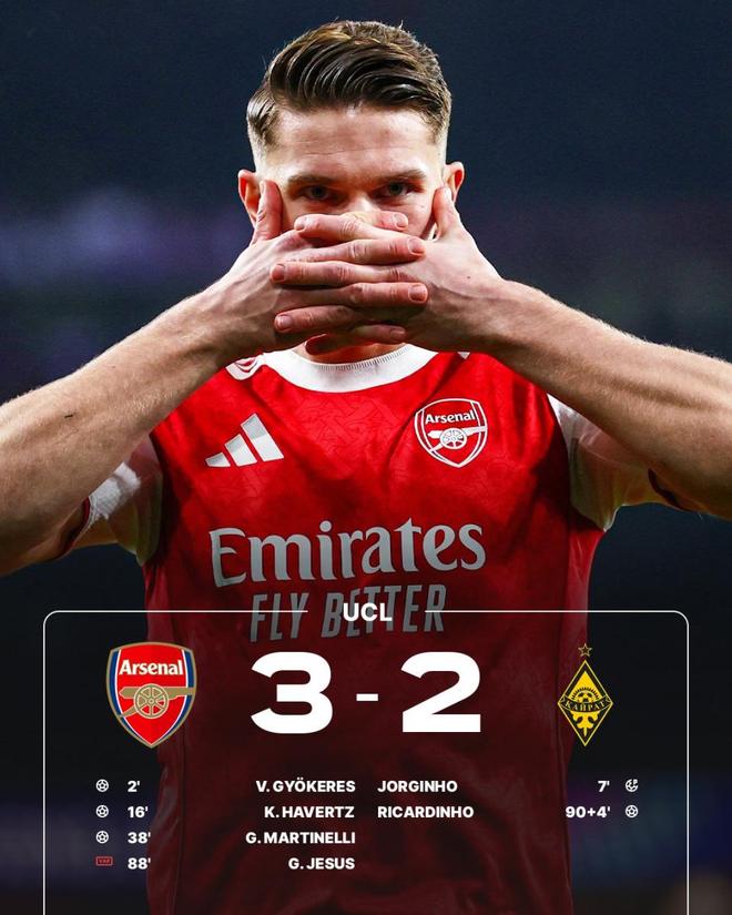 紧接着哈弗茨和马丁内利连续进球,阿森纳半场就建立起3-1优势。
