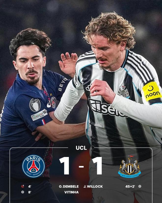 而纽卡斯尔,则成为唯一掉队的英超球队。面对卫冕冠军巴黎圣日耳曼1-1战平,登贝莱失点,维蒂尼亚破门,威洛克扳平,最终却只能携手走向附加赛。