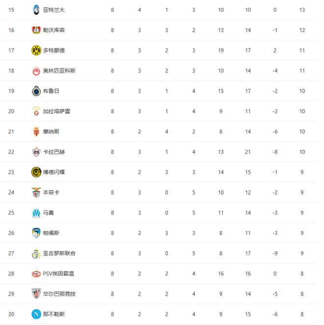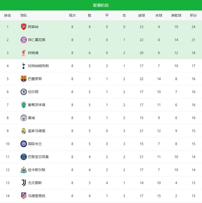 本赛季欧冠联赛阶段最稳的球队阿森纳,8战全胜,直接锁定榜首。