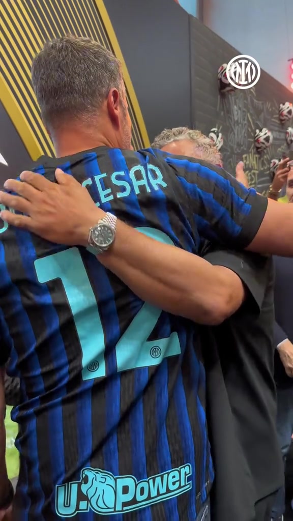 蓝黑色的纽带两位国米老男孩拥抱攀谈