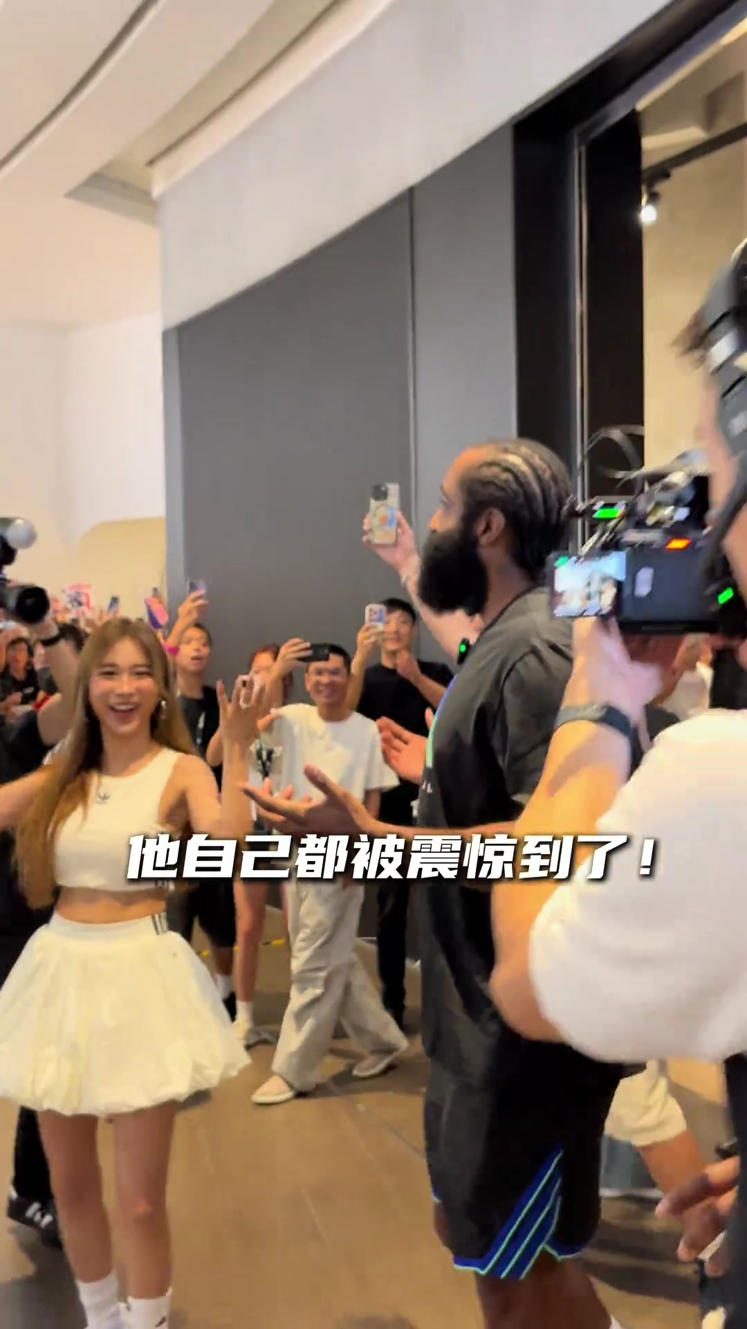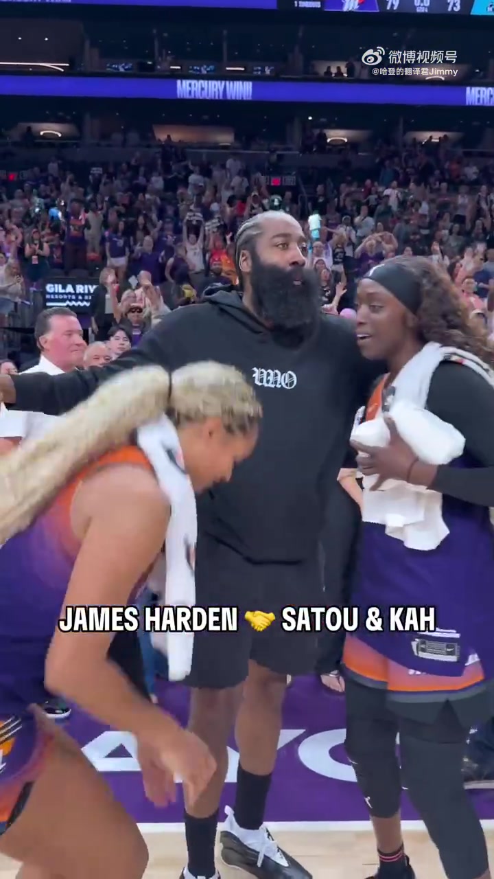 登哥开心得嘞哈登看完女篮比赛和两位女篮球员分别拥抱