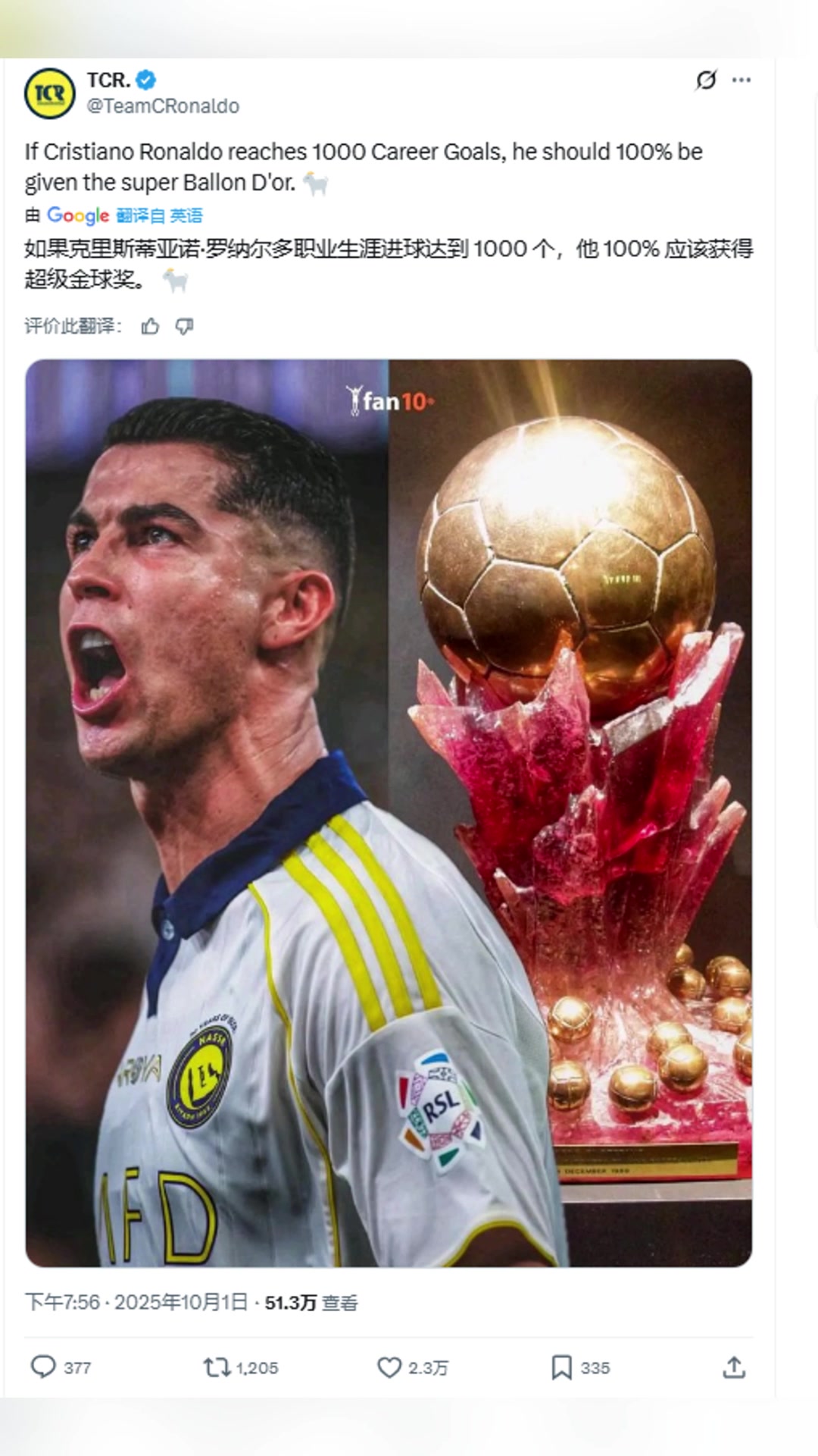 C罗粉丝博主如果C罗进球达到1千他应该获得超级金球奖