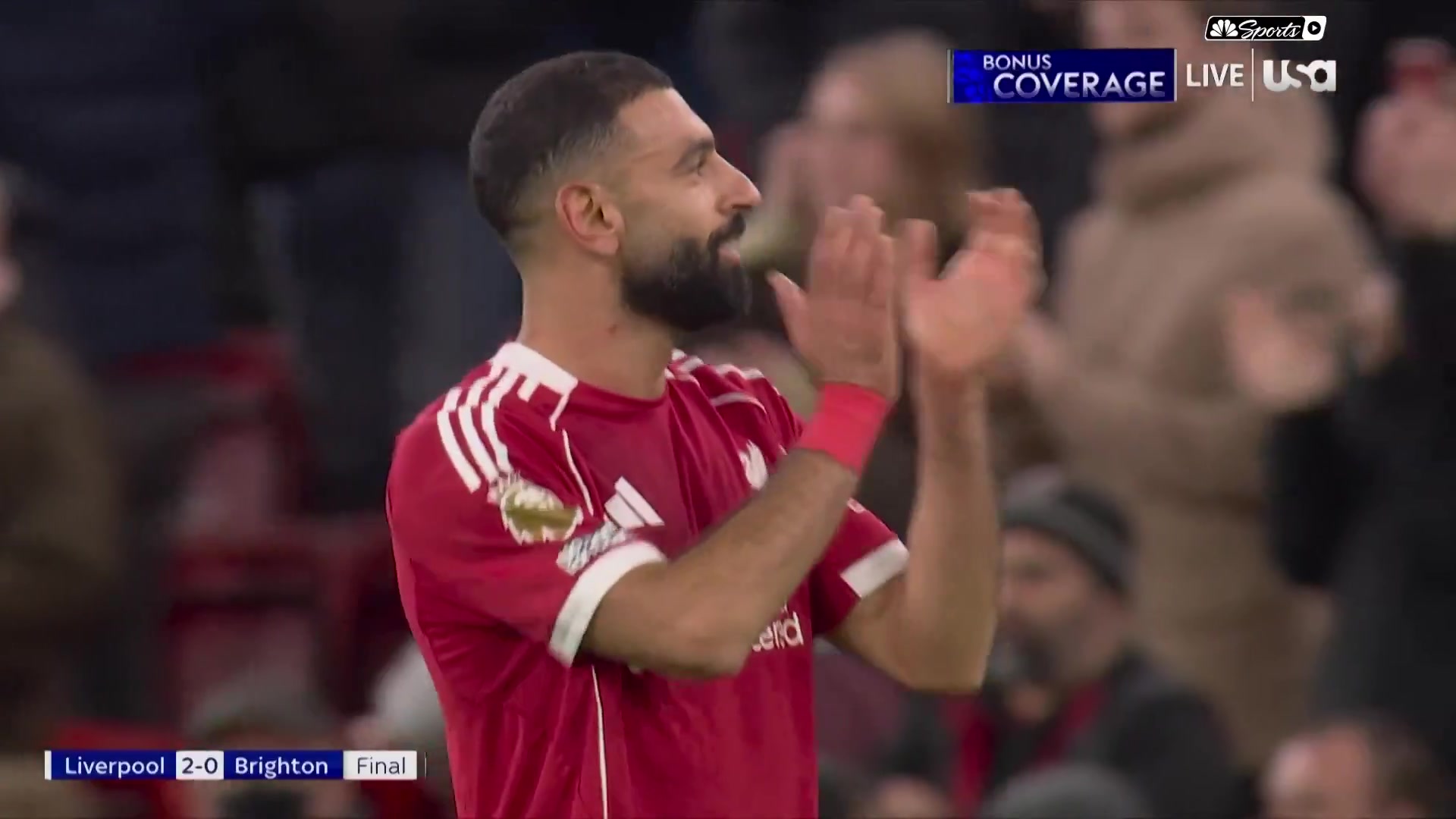 利物浦2-0赢球赛后萨拉赫微笑着向红军球迷致意
