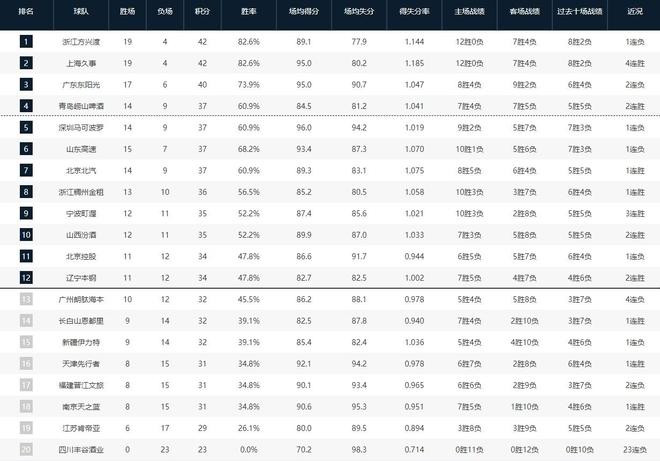 CBA常規賽第一階段排名:廣廈第一,上海第二,四川23連敗墊底