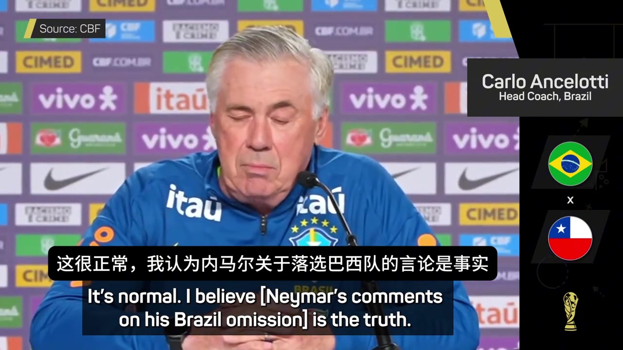 安切洛蒂没人会质疑内马尔的技术水平他落选是因为状态和体能